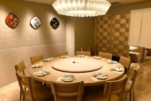 店内は、優しい温もりを感じさせる木目調のデザインを多く取り入れ、落ち着いた雰囲気。客席は多彩なバリエーションを用意し、ハイバックソファを設けたボックス席や円卓席、回転テーブルを備えた半個室席など、ご家族連れから大事な会食まで、利用シーンに合わせて選択OKです。