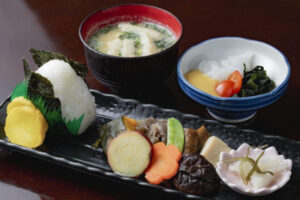 精進ごはんの卓には、大きな海苔むすびひとつに、煮しめ、酢の物、刺身こんにゃく、味噌汁というシンプルながらも充実したラインナップが並びます。品数こそ多くはありませんが、それぞれが丁寧に作られていて、食べ終えると確かな満足感があります。