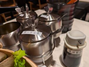 スープはあえてやさしい薄味の仕上げとなっています。薬膳醤油、山椒オイル、豆板醤、ガーリック、塩──。卓上に並ぶ調味料で、自分好みに味を作っていくのがこの鍋の醍醐味。最初はシンプルに、途中から薬味を重ねていくと、味わいが深まっていきますね。