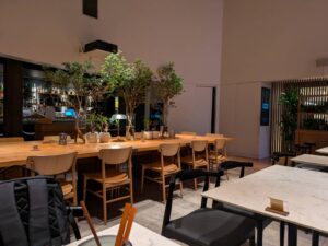 入り口からして高級チックな雰囲気。中に入ると、空気が変わります。天井が高く、緑がふんだんに配された店内。大阪の喧騒を忘れさせるほど落ち着いた雰囲気ですね。テーブル間のゆとりも心地よく、ひとり静かに食事を楽しむお客さんや仲間とワイワイ囲むグループ客も。それぞれのペースでディナーを満喫していますね。
