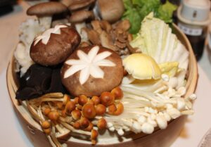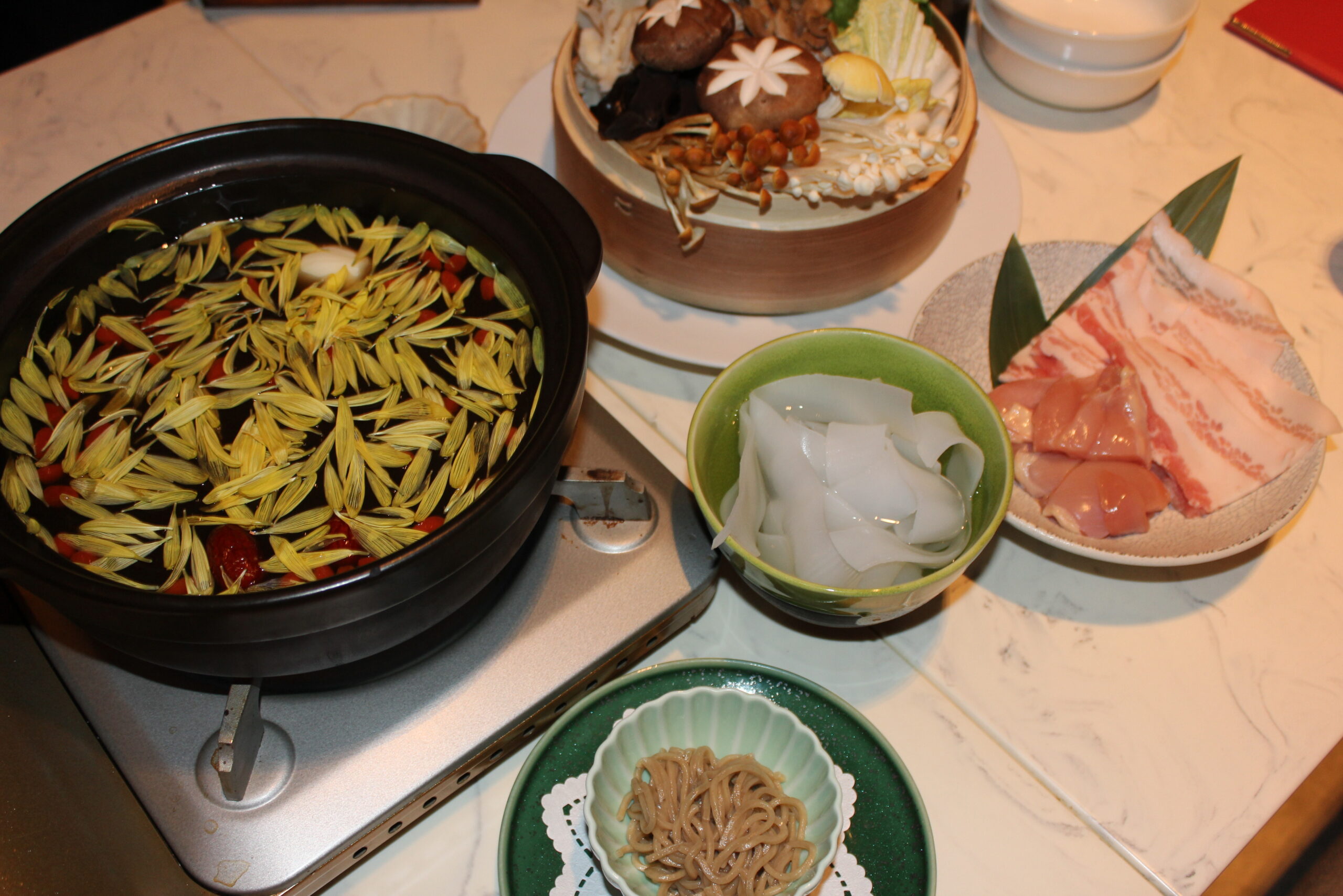 テーブルに運ばれてきた具材を見て、まず目を奪われるのがきのこの種類の多さ。この日は椎茸、榎茸、茶榎茸、タモギダケ、ハナビラダケ、大黒しめじ、舞茸という顔ぶれです。白菜やきくらげも加わり、鍋には最初から入っている菊花、なつめ、ニンニクなどが最初から入っています。トウキという本格的な漢方食材まで。