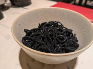 〆の麺は3種からセレクト。今回オーダーしたのは、見た目にもインパクトのある黒い「竹炭麺」です。スープをたっぷり吸い込ませたその一杯は、鍋の締めくくりにふさわしい満足感をもたらしてくれました。