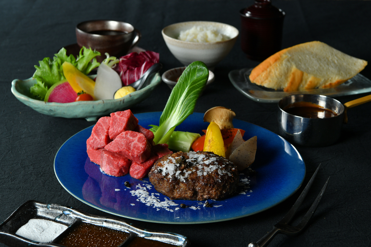 主役となるのは、鉄板で調理する国産牛のサーロイン・フィレステーキ、そして黒毛和牛100%のハンバーグ。黒毛和牛はあえてA4等級を使用。噛むほどに広がる旨みと、すっと消えていく後味の軽やかさ。その絶妙なバランスが、最後のひと口まで心地よい満足感を生み出し、重たさを残さない心地よい余韻が特長です。