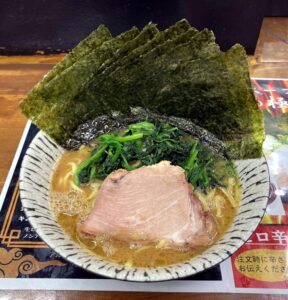 八家本陣の主力は家系ラーメンで、海苔やほうれん草が乗った標準的なラーメンが中心メニューです。“クラシック家系の骨太さ”を残しつつ、**スープと麺を一新したリニューアル系**として語られる一軒。