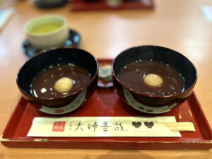 朱塗りの盆に並ぶ二椀の善哉は、それ自体が一幅の絵になっています。深い小豆色と白い餅、そして朱色が交わるコントラストは、写真に撮っても映えますが、実際にその前に座ったときの満足感はひとしおです。器や箸袋の設えにも長い歴史が宿っていて、空間全体がひとつの作品のように機能しています。
