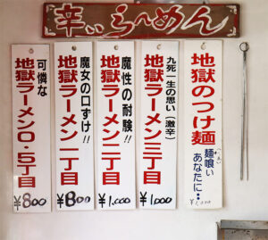 メニューは、辛さに挑む「地獄らーめん」シリーズから、出汁香る「支那そば」や背脂こってり系まで。食の冒険が始まる、ラーメン屋と言えます。