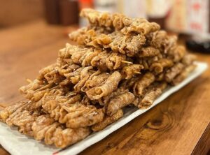 一般的な串焼きと異なり、伝串はタレや調理工程に工夫が施されています。油っぽさを感じにくく、何本食べても重くなりにくい点が特徴です。また、提供時に積み上げられた独特の盛り付けは視覚的なインパクトも強く、SNSで話題になりやすい要因となっています。この独自性が、他店との差別化につながっています。