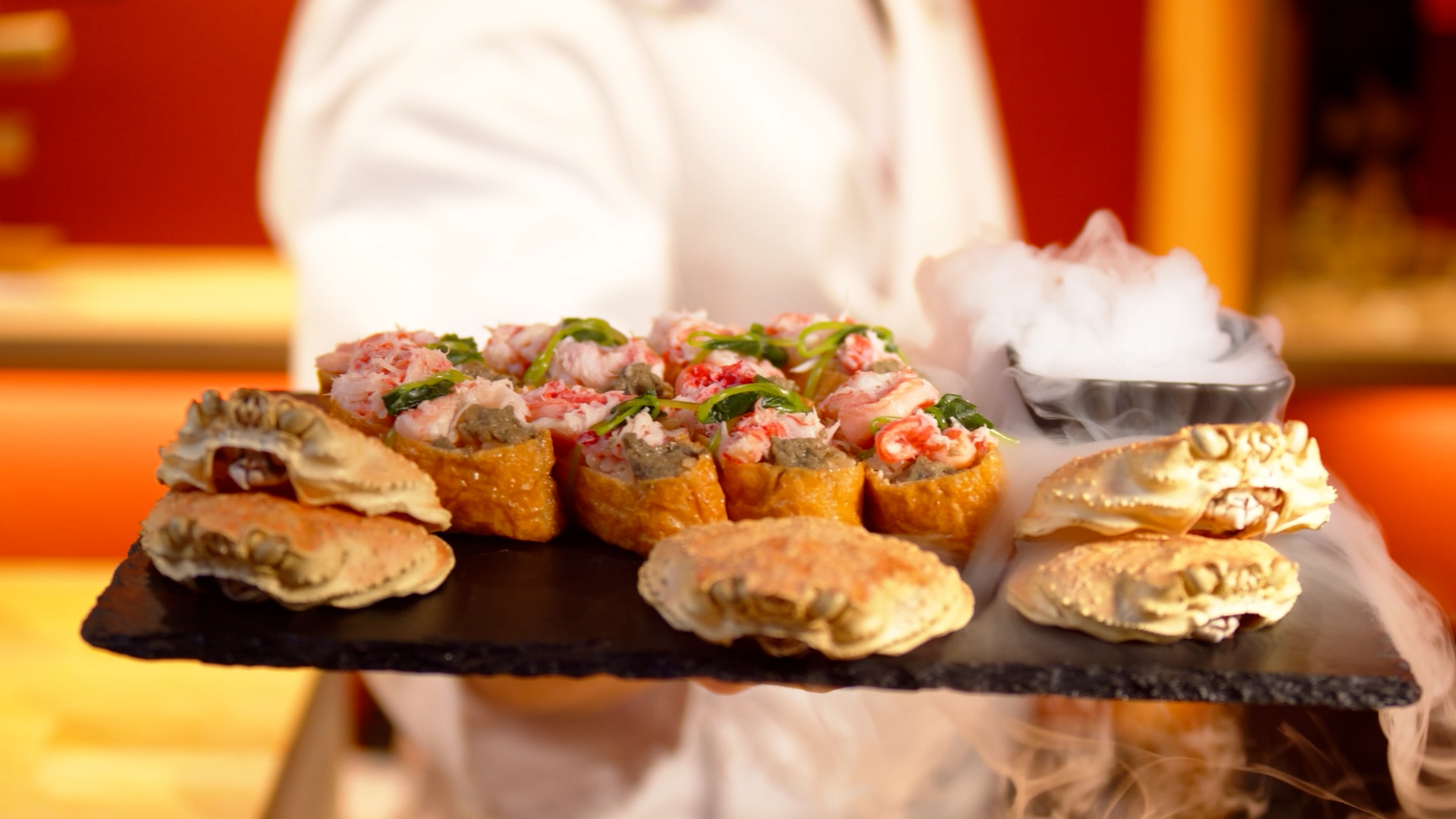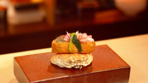 北新地 × 4,400円 × 本格鮨15品。完全予約制×食材ロス削減で成立させた、挑戦型エンタメ鮨。主役はトロでもウニでもない。祖母のいなり寿司を“逆転”させた名物「逆さいなり」です。