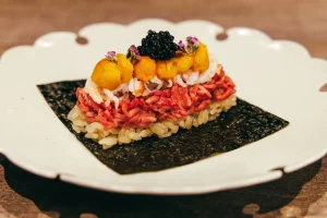 「ずわい蟹と生雲丹の和牛手巻き キャビア添え」(2貫 5,000円)も人気だって。